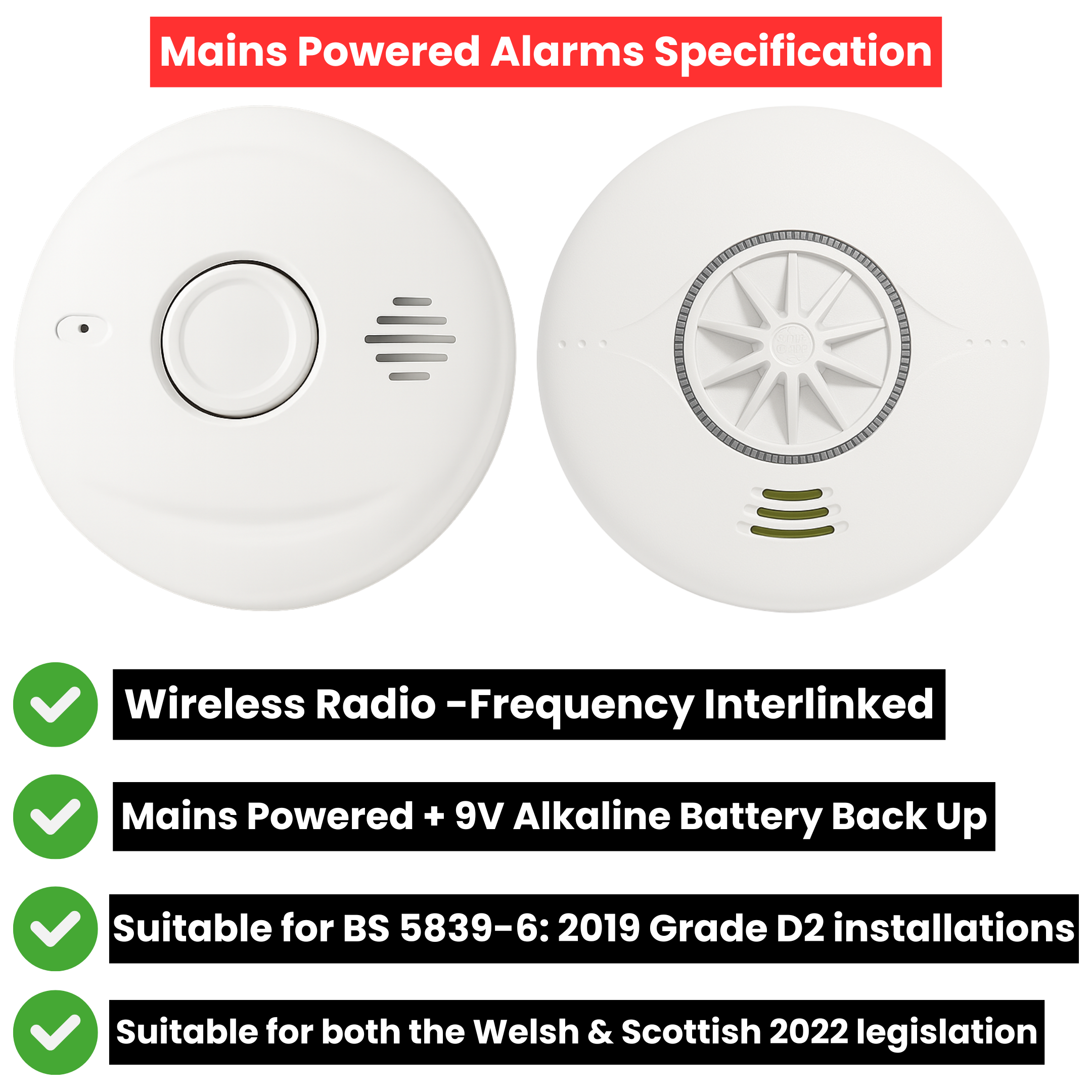 Our Mains Powered alarms meet all requirements of the Renting Homes (Fitness for Human Habitation) (Wales) Regulations 2022 — ensuring your property is fully compliant and protected.